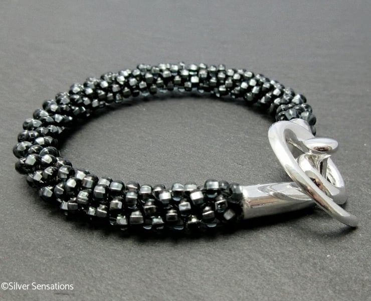 This handmade silvery black beaded Kumihimo bracelet has been designed using 3mm Preciosa Czech glass seed beads.