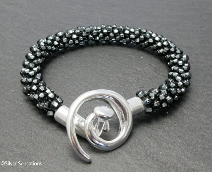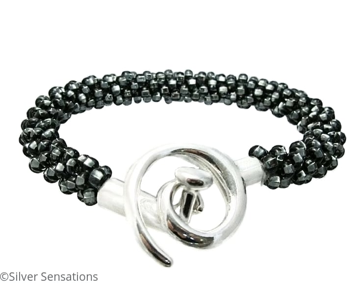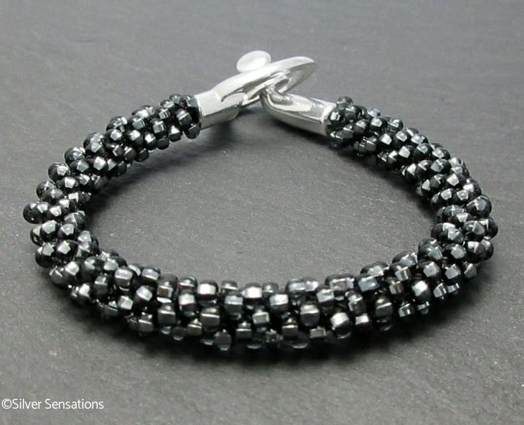 This handmade silvery black beaded Kumihimo bracelet has been designed using 3mm Preciosa Czech glass seed beads.