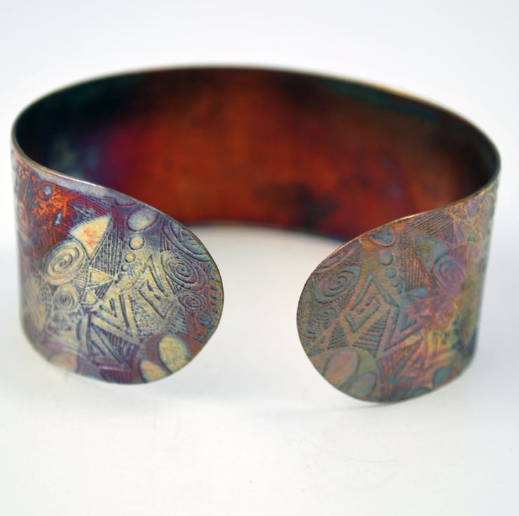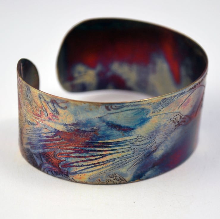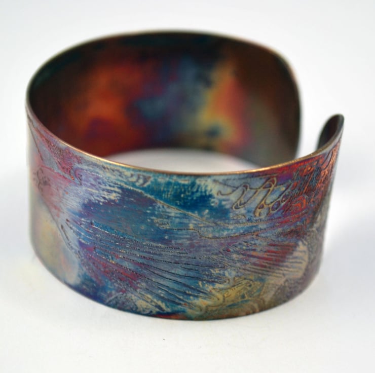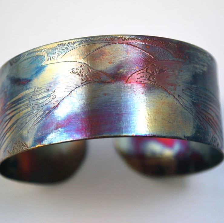 This etched copper crow or raven cuff bracelet has been heat treated to create a vibrant multicoloured patina: this will deepen over time. I have developed a technique of literally 'painting' with a flame to manipulate the shape and direction of the colours. Although there is a degree of control, each piece is unique, as the colour patina cannot be replicated exactly.