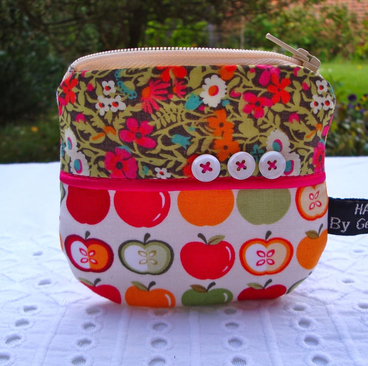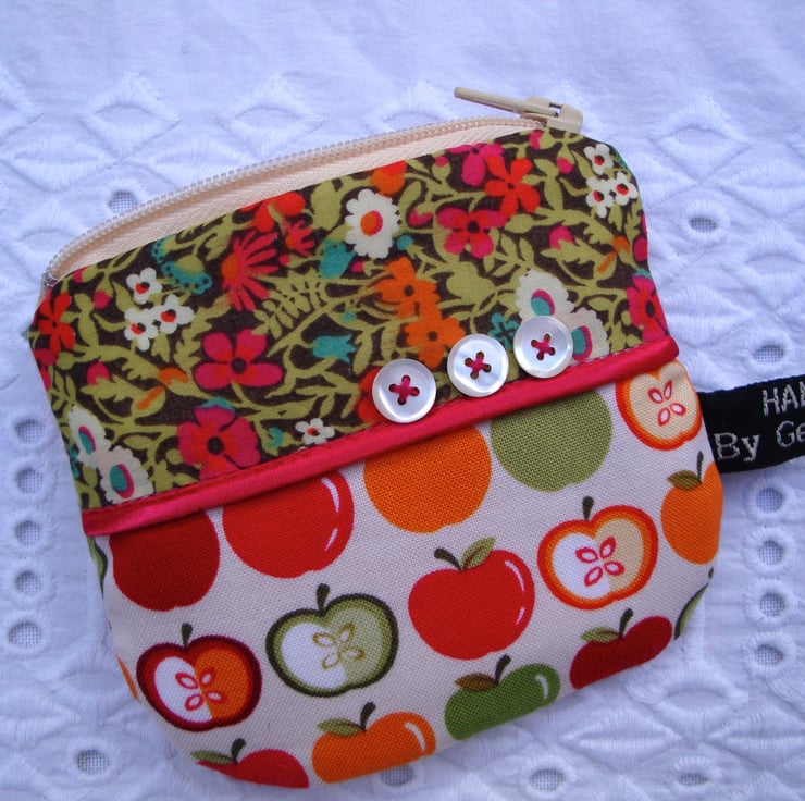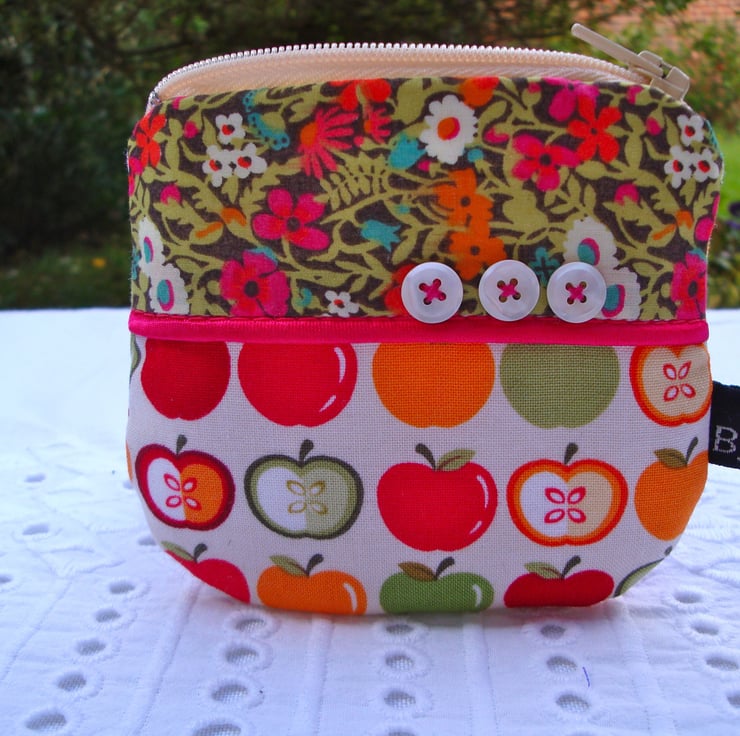 Back of purse - and lower front has been made in a cotton apple print . Top half in a Liberty floral cotton print . Embellished with buttons - and red piping.