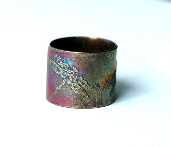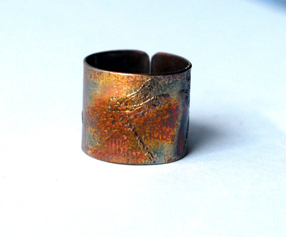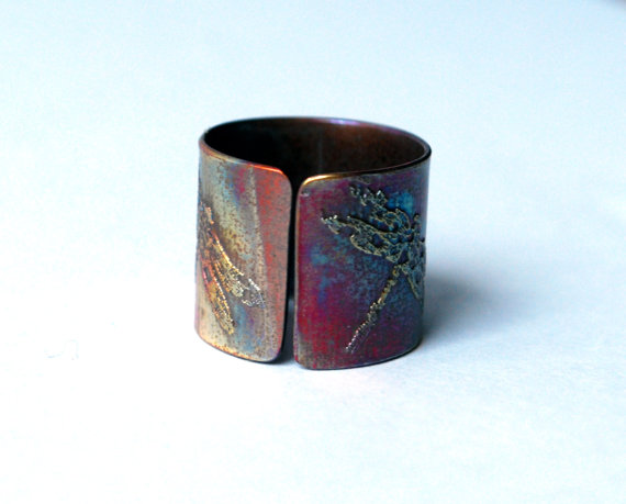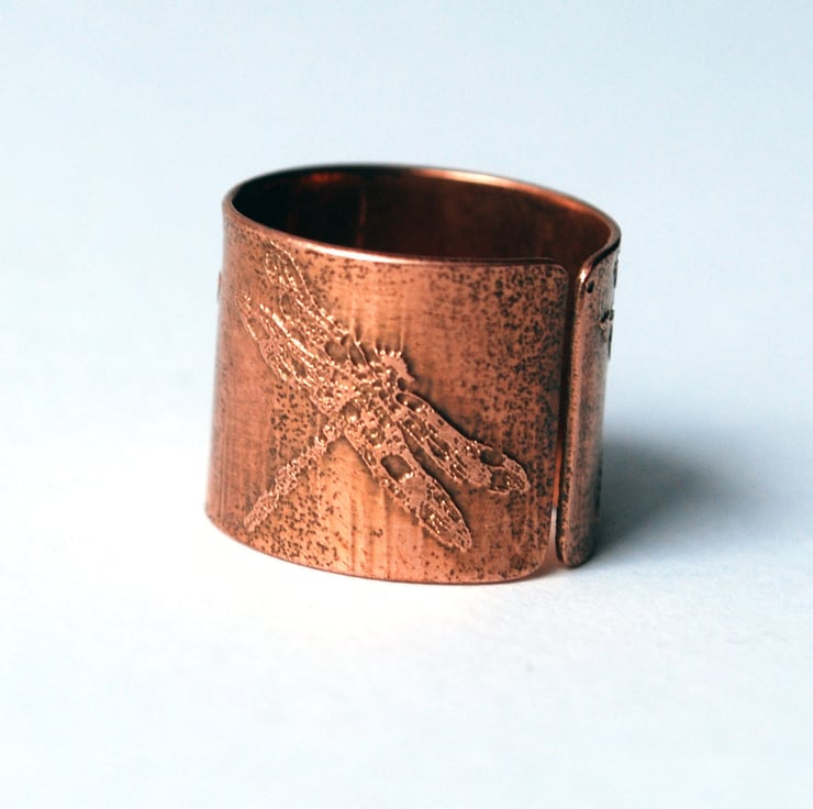 This etched copper ring is etched with a repeating dragonfly pattern. It is open at the back, allowing them to be adjusted to size. The copper is etched using non toxic processes, hand cut and formed using traditional jewellery tools. This etched copper ring can be pinched or stretched to size.It comes in natural copper or heat coloured to create a vibrant multicoloured patina: (this will deepen over time.)