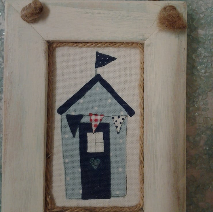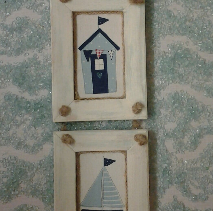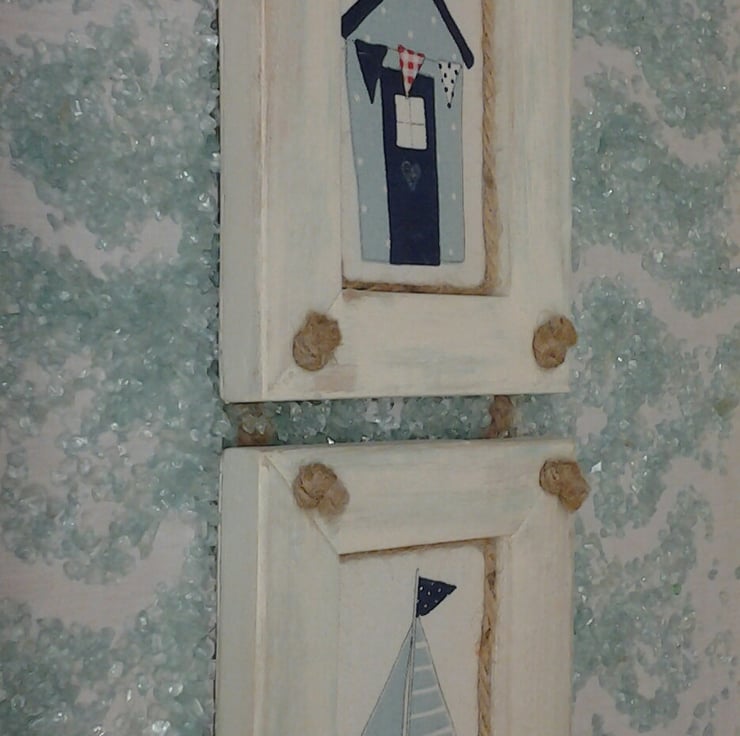 This delightful bathroom wall picture has been created using two small pine wood frames, painted white and blue then embellished with nautical themed buttons and string. The pictures themselves are from printed fabric that has been mounted onto card and embellished with diamantes and glitter to give a little sparkle.