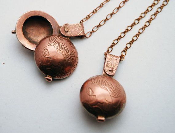 This Copper owl locket has an etched owl design on both sides of this swivel opening piece. The two domed copper sides of this copper swivel locket have been chemically etched using environmentally friendly techniques: The original image is drawn by hand or by using a graphics tablet to draw straight into CAD form and then manually transferred to the metal as a resist and etched. I then cut, form and polish by hand.