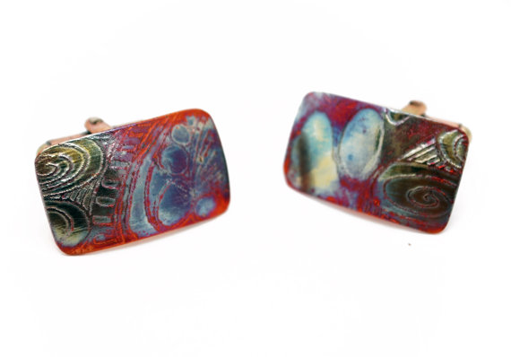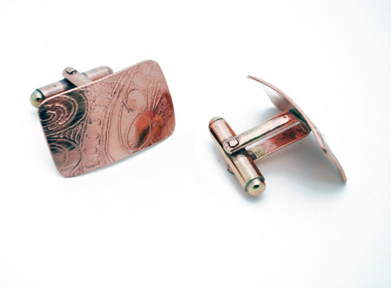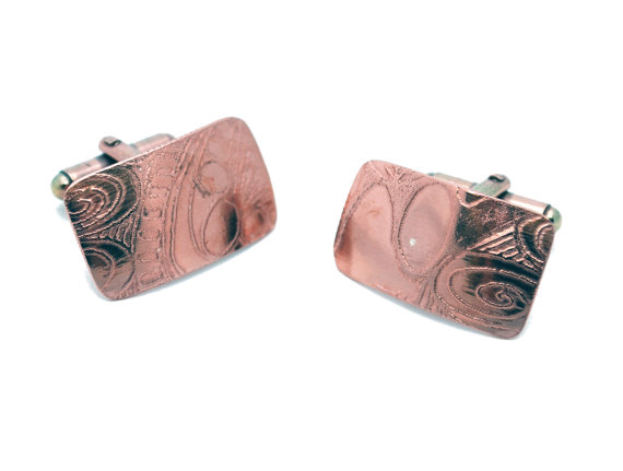 These etched copper cufflinks have been handmade in my home studio using solid copper sheet and solid brass swivel cufflink backs. The backs have been soldered to the front plate with silver solder,ensuring a strong, durable connection. The etched patterned fronts are slightly curved to give a professional, ergonomic shape: they are available in heat coloured or natural copper finishes. (please specify your preference upon purchase) Polished to a mirror shine.