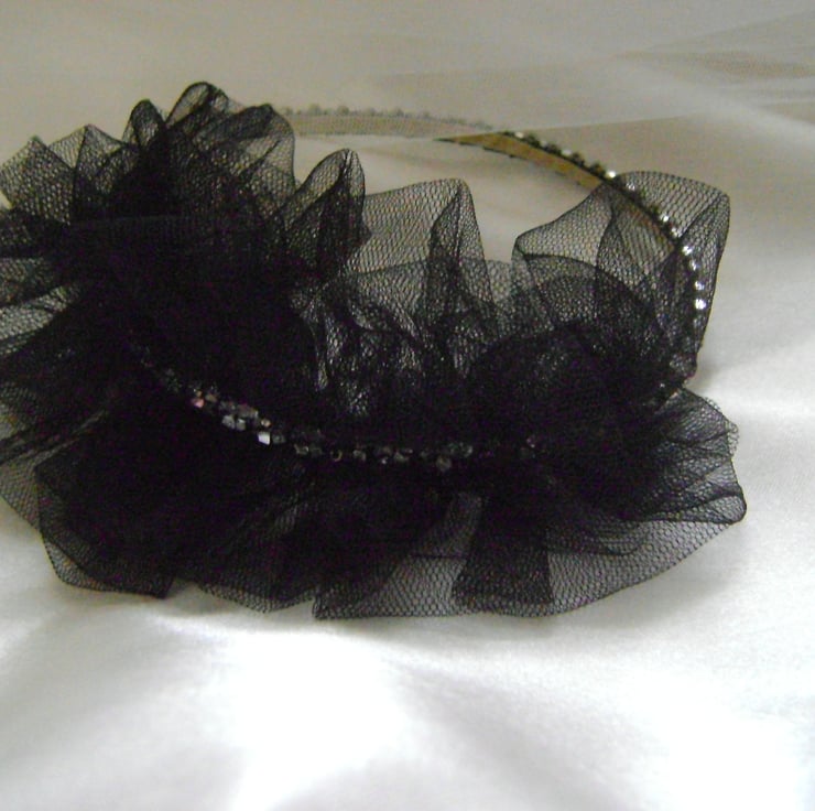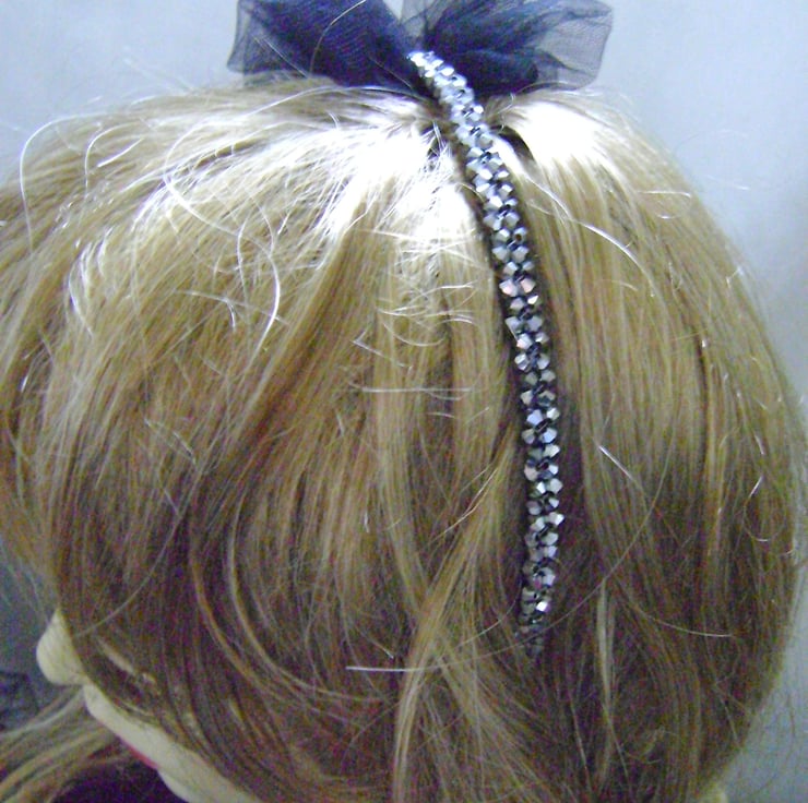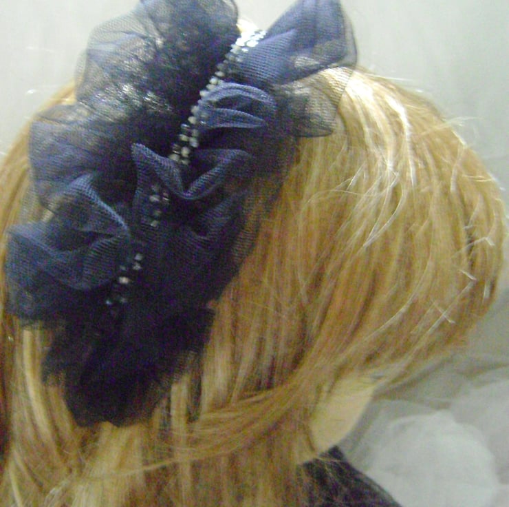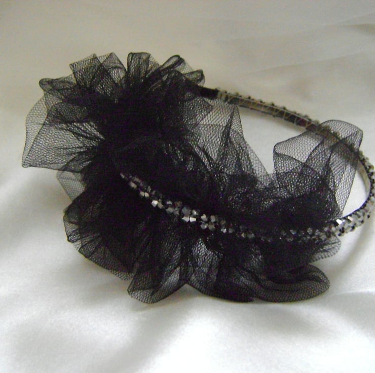 A seriously chic hair accessory that adds a touch of vintage style to any special occasion. This particular fascinator is mounted on an eye catching beaded band with seductive black netting arranged on one side.