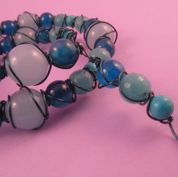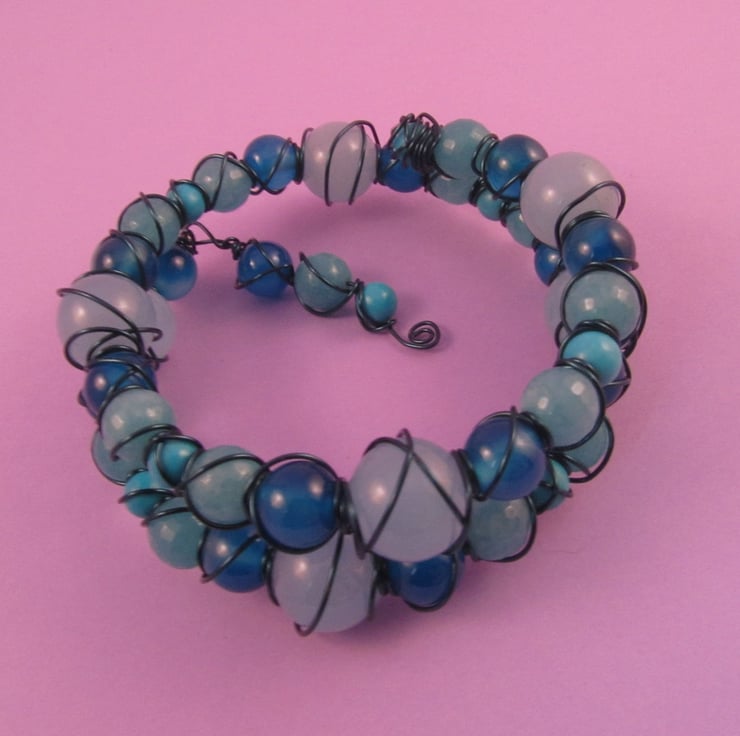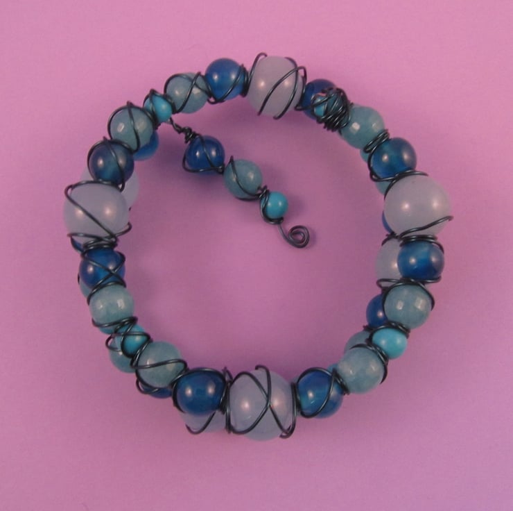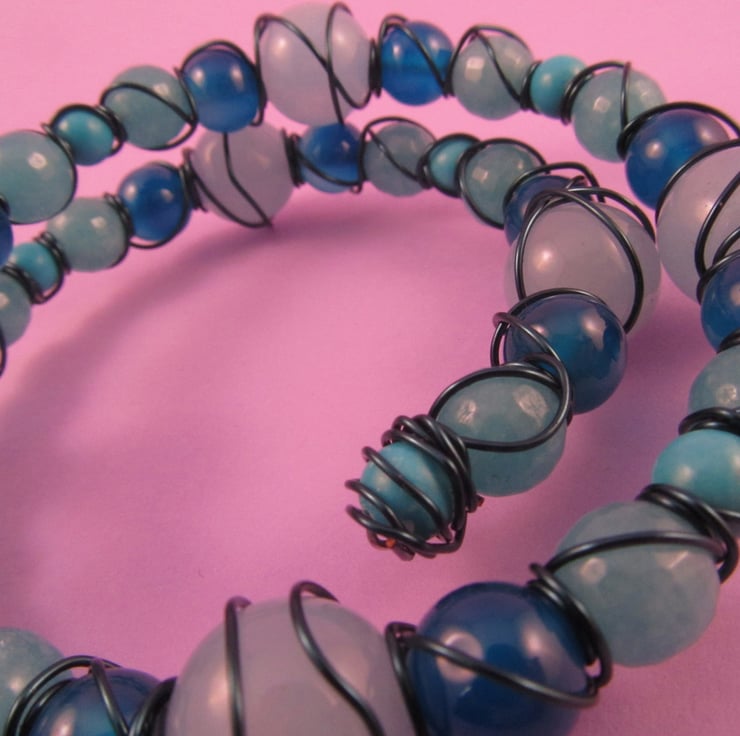 I had these beautiful gemstone beads that looked so good together, that I had to create something. I decided on a memory wire bracelet and then wire wrapped it. The result was this colourful quartz blue bracelet.