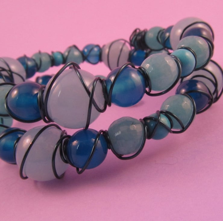 This beautiful light blue quatzite, quartz, and agate wire wrapped memory wire bracelet will fit any wrist size. It features blue faceted quartzite, dyed blue quartz and blue agate. It is wire wrapped with dark blue silver plated copper wire. This bracelet uses real quartzite, real quartz and real agate gemstones.