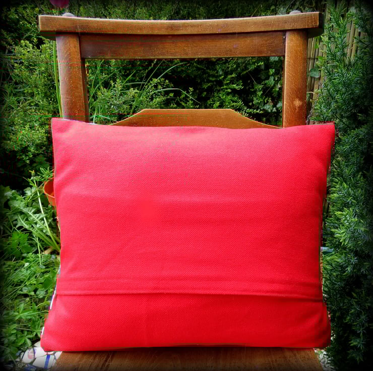 There is a deep envelope opening on the reverse of this cushion, which is a cherry red heavyweight cotton.