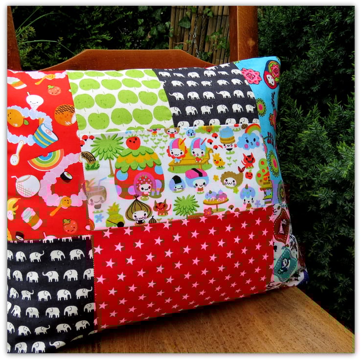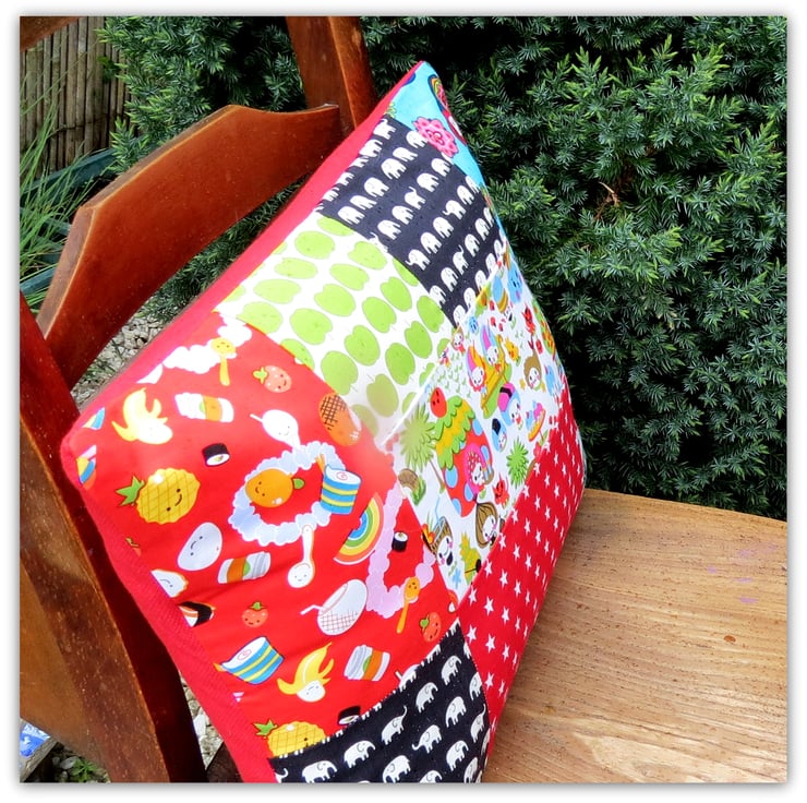 Add a touch of colour to a child's room with this vibrant patchwork cushion.