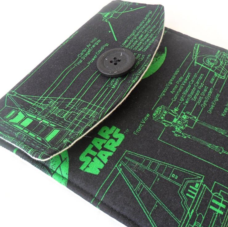 A great Father's day gift and perfect for any Star Wars fan, this iPad mini case is sure to delight! It is made in a black cotton fabric with Star Wars technical drawings printed in green. Closing with a Velcro strip and finished with a black button this iPad mini cover has an internal measurement of 20 cm x 15 cm (8" x 6"). It is fully lined in cream cotton sateen and is lightly padded to protect your tablet.