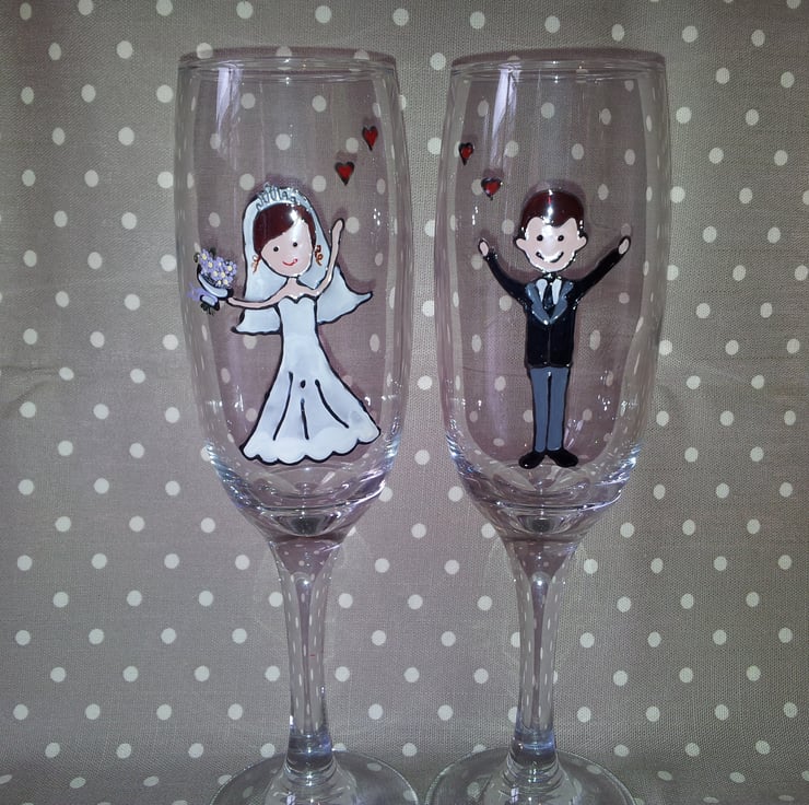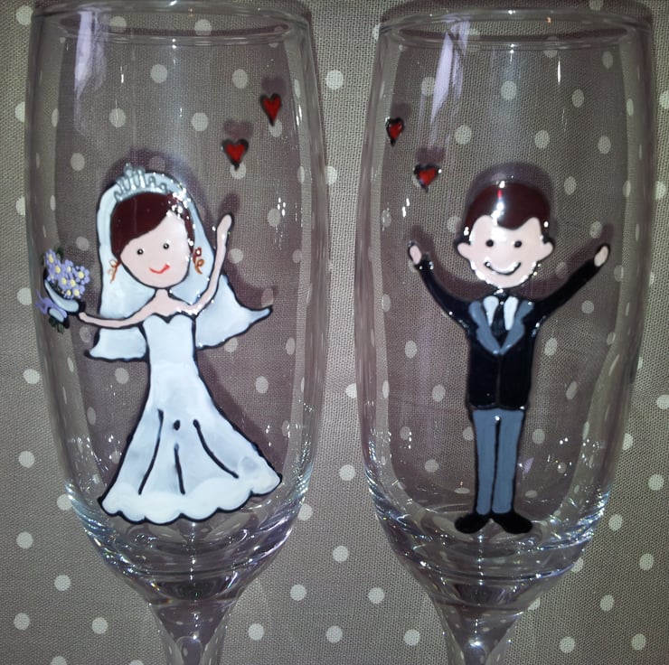 These glasses would make a lovely unique gift for the ‘happy couple’. They can be personalised in any way for example hair colour, two grooms, two brides. You can also have a name or the date on the base of the glass. Please message me with any special requirements.