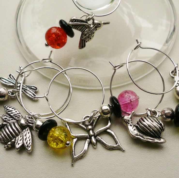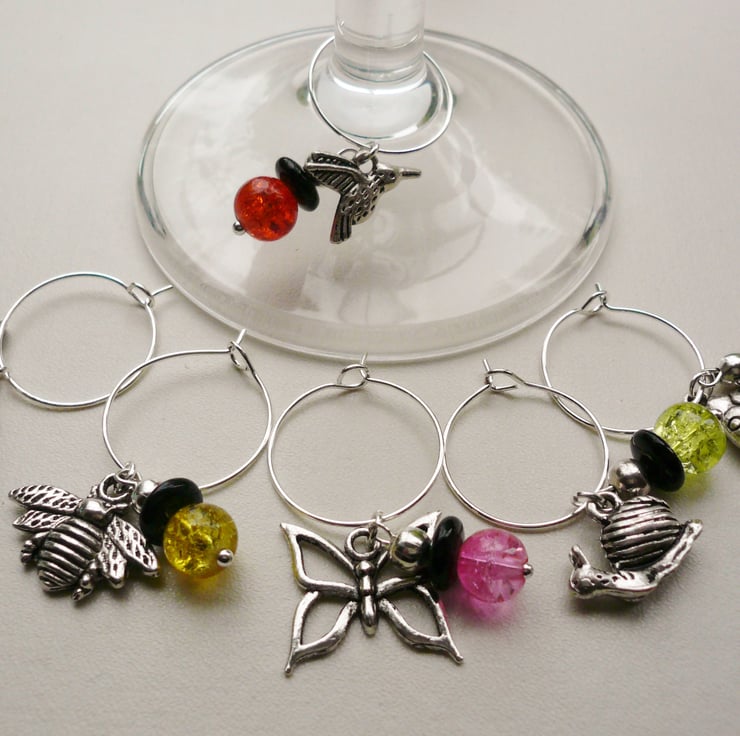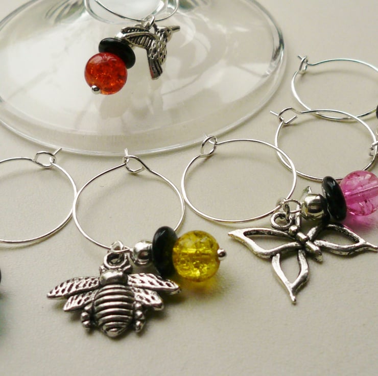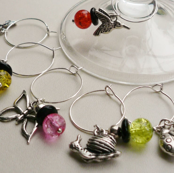 This set of six wine glass charms is made up of Gardeners 'friends or foes' Tibetan silver charms in the forms of bee, butterfly, bird, ladybird, dragonfly and snail. Each with a different coloured 8mm glass crackle bead, black glass rondelle and silver spacer bead attached. All attached to 20mm silver plated rings.