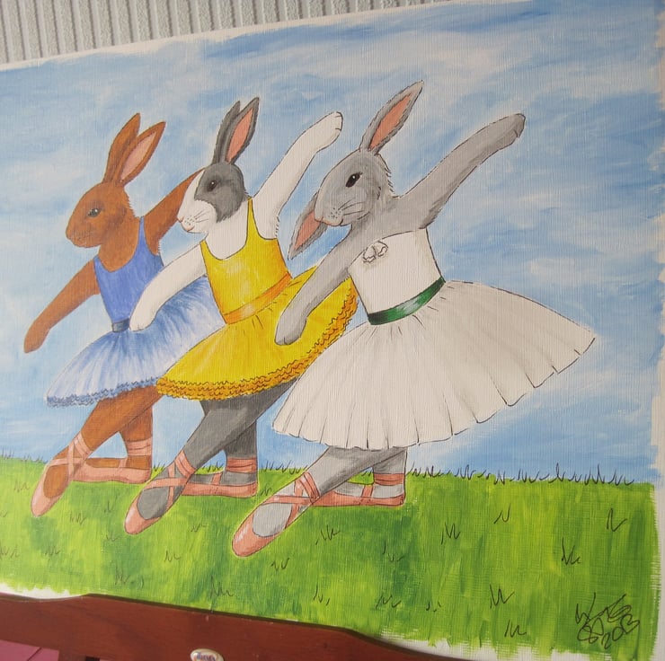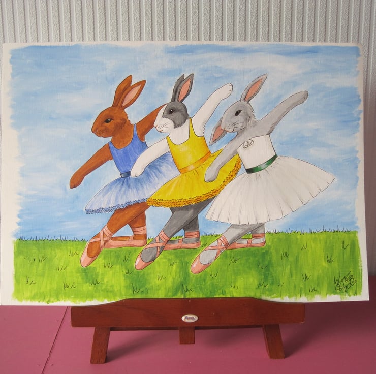 This piece of art features 3 of the Ballet BunBuns, from my range of dancing bunnies. Bluebell is in the blue tutu, Primrose in the yellow tutu, and Snowdrop in the white tutu.