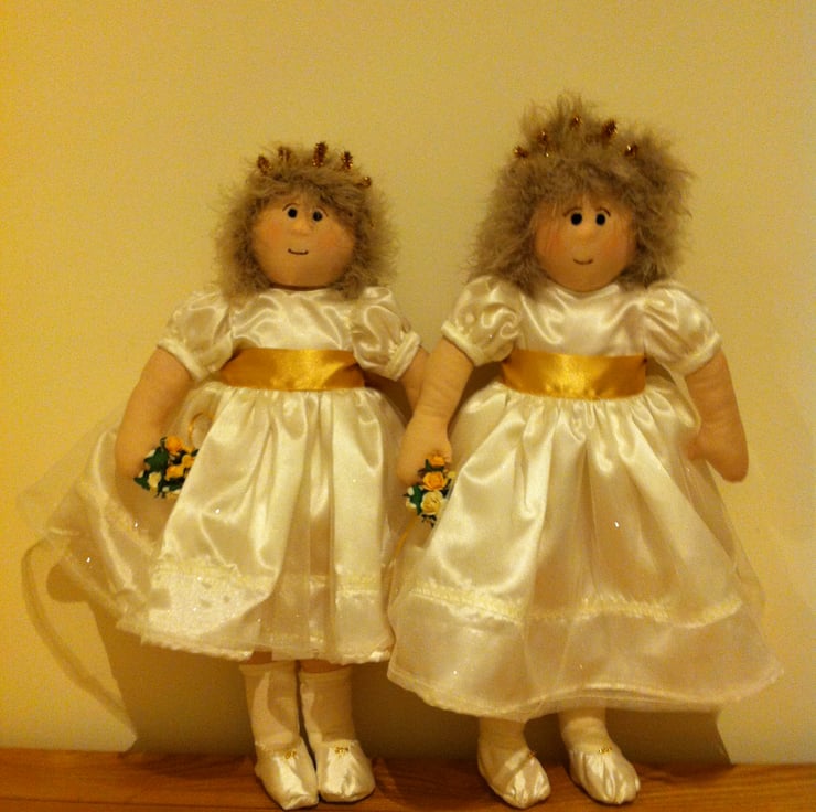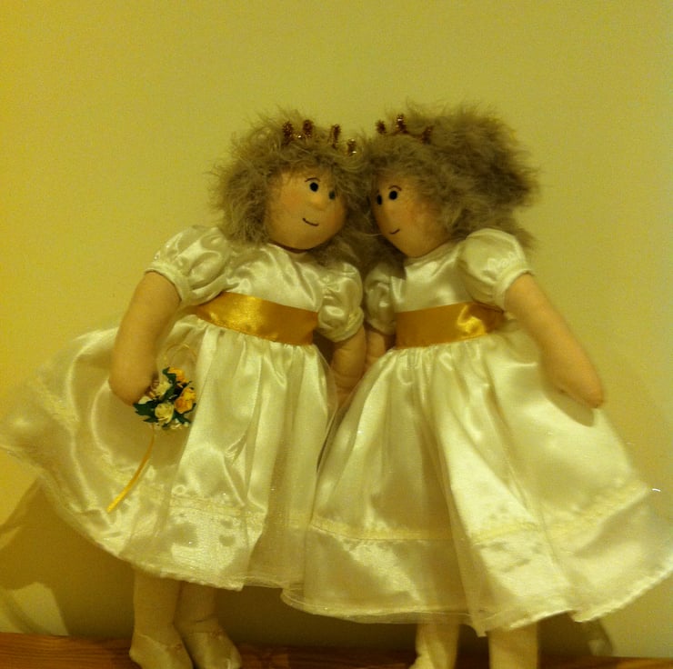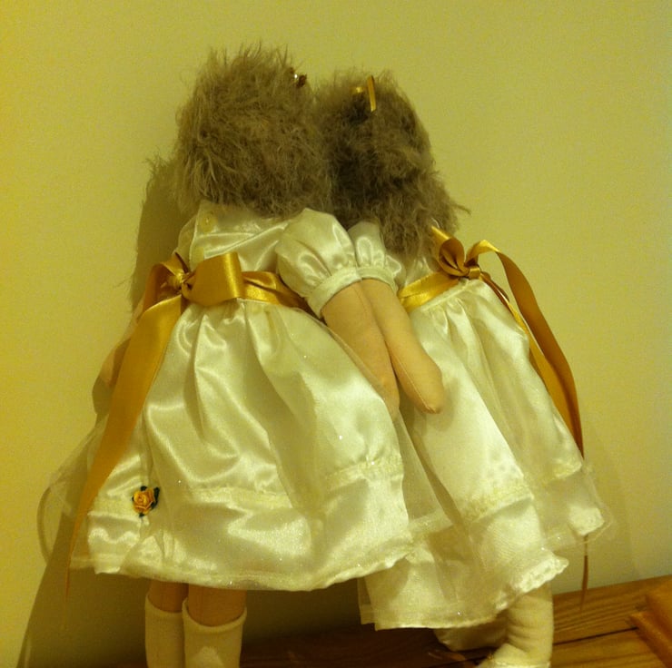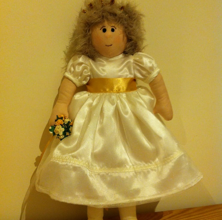 Kitty is such a pretty bridesmaid in her ivory satin dress with a tulle overlay. The dress has puffed sleeves and a high waist and has a sash of gold satin which fastens at the back with a bow. She has ivory pants and socks and pretty little satin slippers decorated with gold beads. Kitty has shoulder length hair tied up at the sides with gold ribbon, a gold tiara and she is carrying a little posy of gold and cream roses. She comes in a gold organza bag decorated with her name. Totally gorgeous!