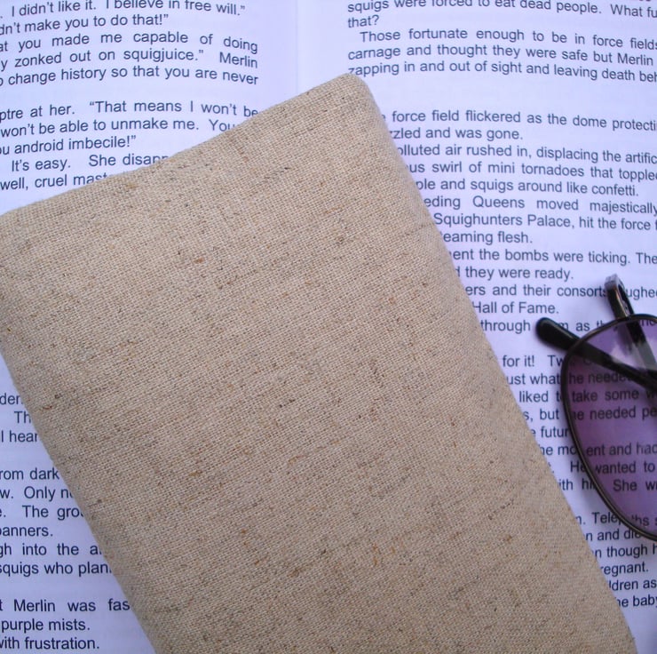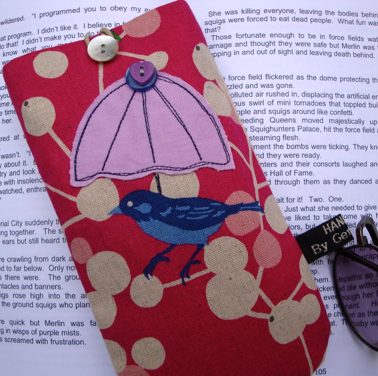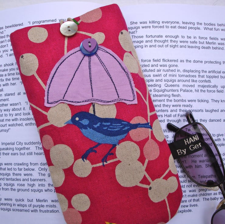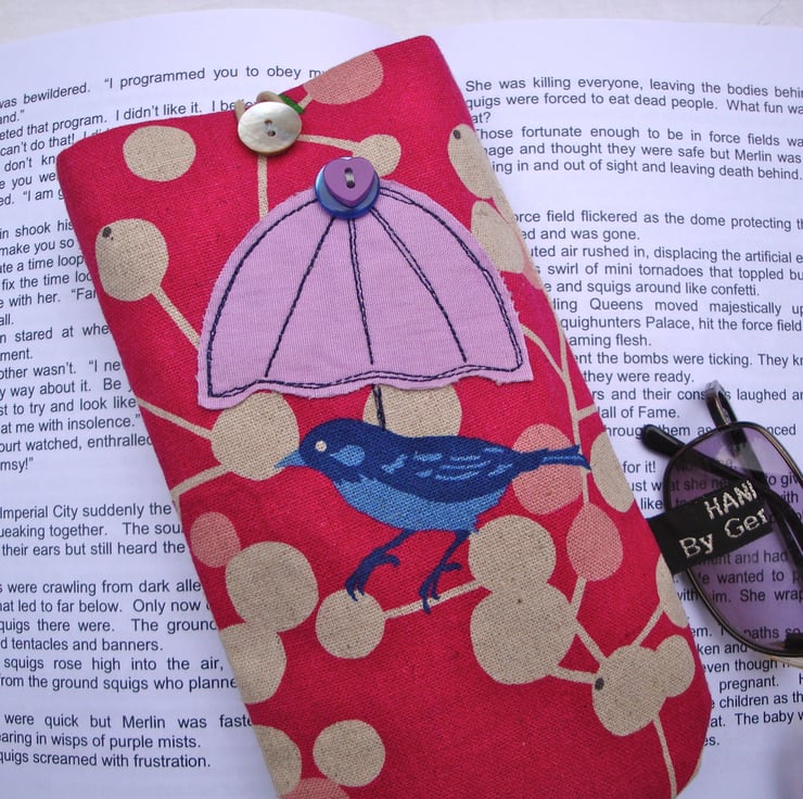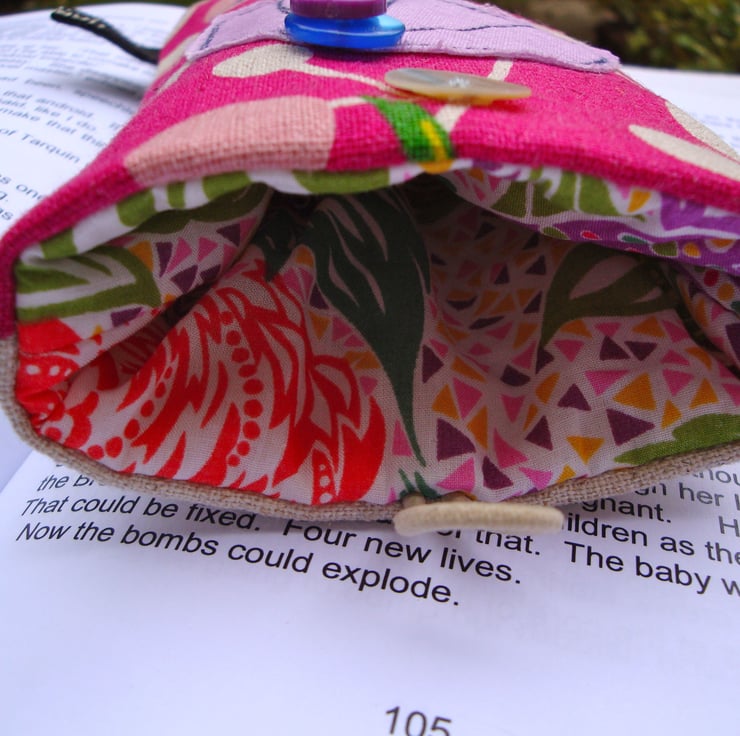 Front of case has been made in a Japanese linen / cotton fabric - featuring birds - on a raspberry pink back ground . Back is made in a plain natural linen fabric ( see photo )