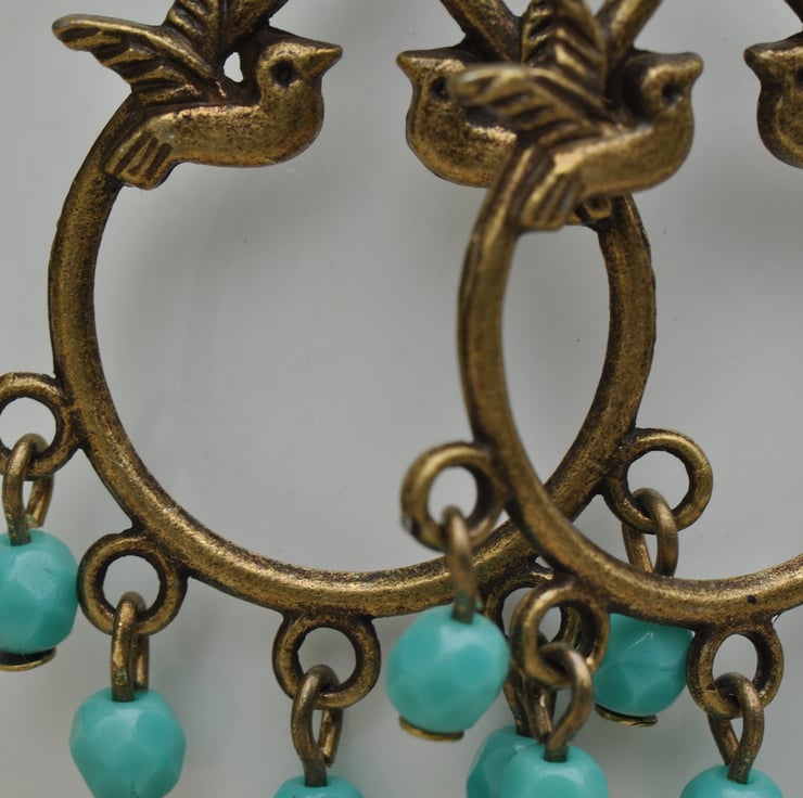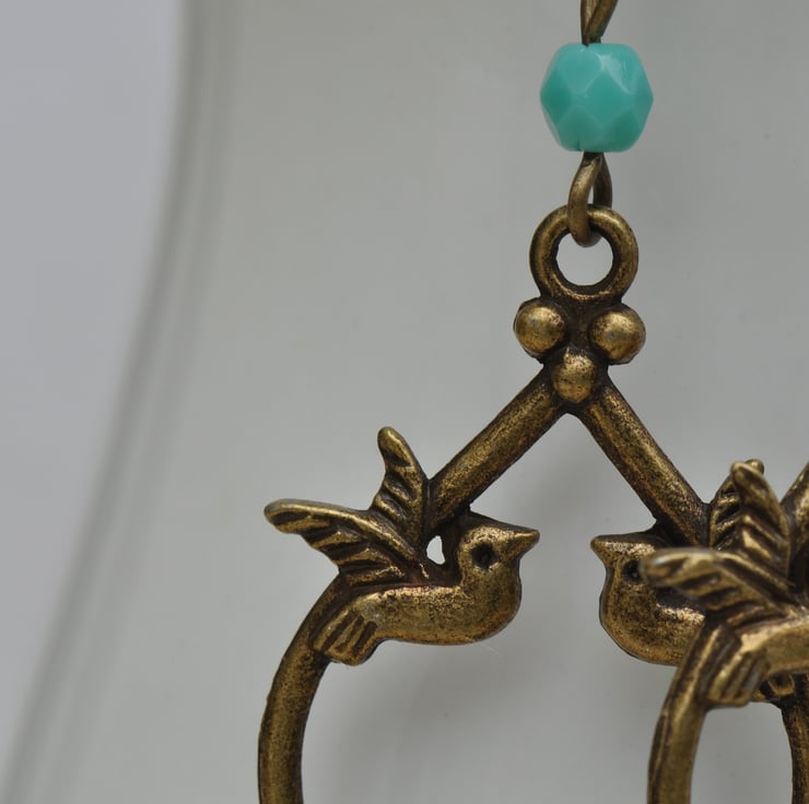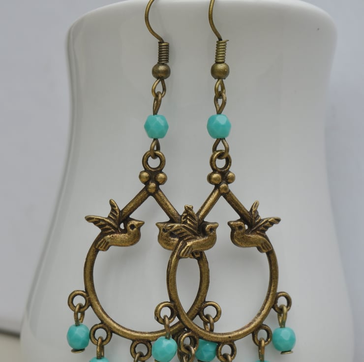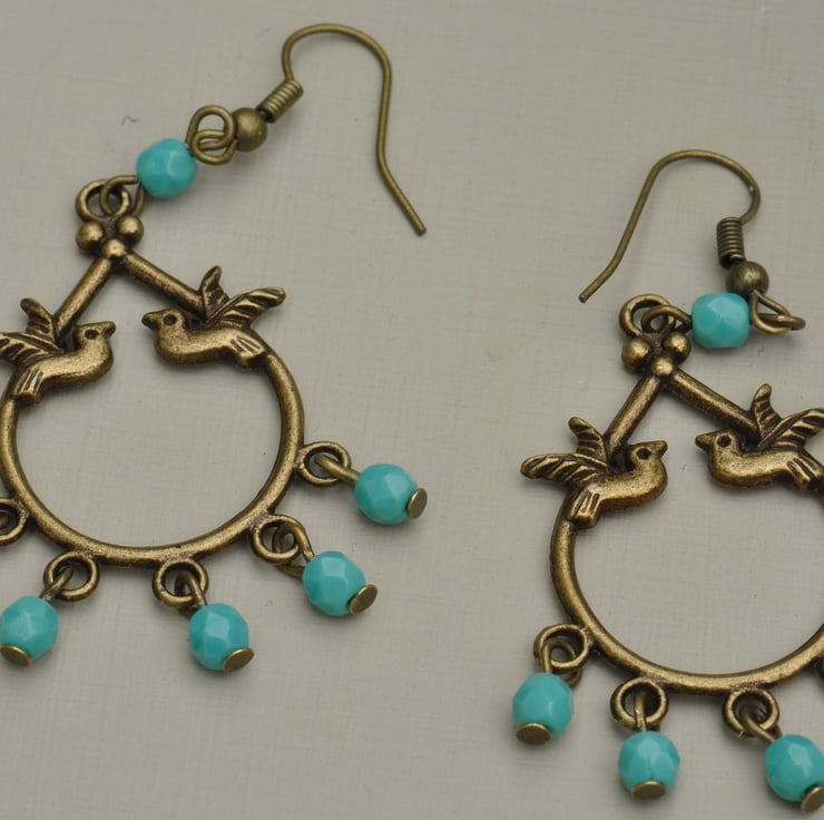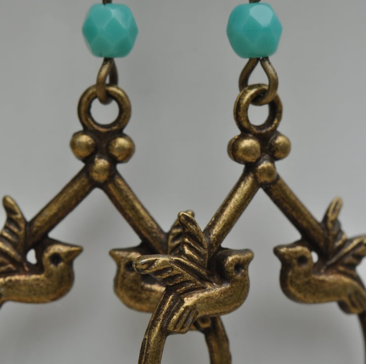 Lovely antique bronze plated chandelier decorative earrings with little birds and dangles of Czech turquoise opaque firepolished beads on antique bronze plated earwires.