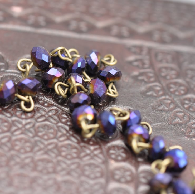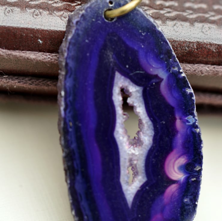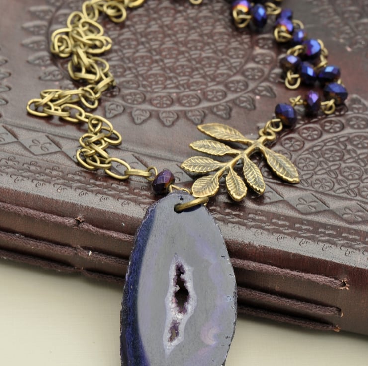 A stunning deep purple agate slice pendant is the main focal of this piece. I have teamed it with an antique bronze plated leaf connector with one strand mainly chain and the other totally beaded with beautiful Czech purple iris AB finish rondelle beads to act some sparkle and charm, finished with a trigger clasp.
