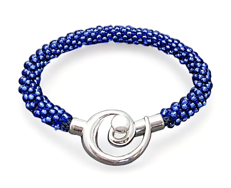 The clasp is silver plated and is in the design of a swirl and a toggle bar which slides around the swirl clasp creating a lovely feature for this bracelet.