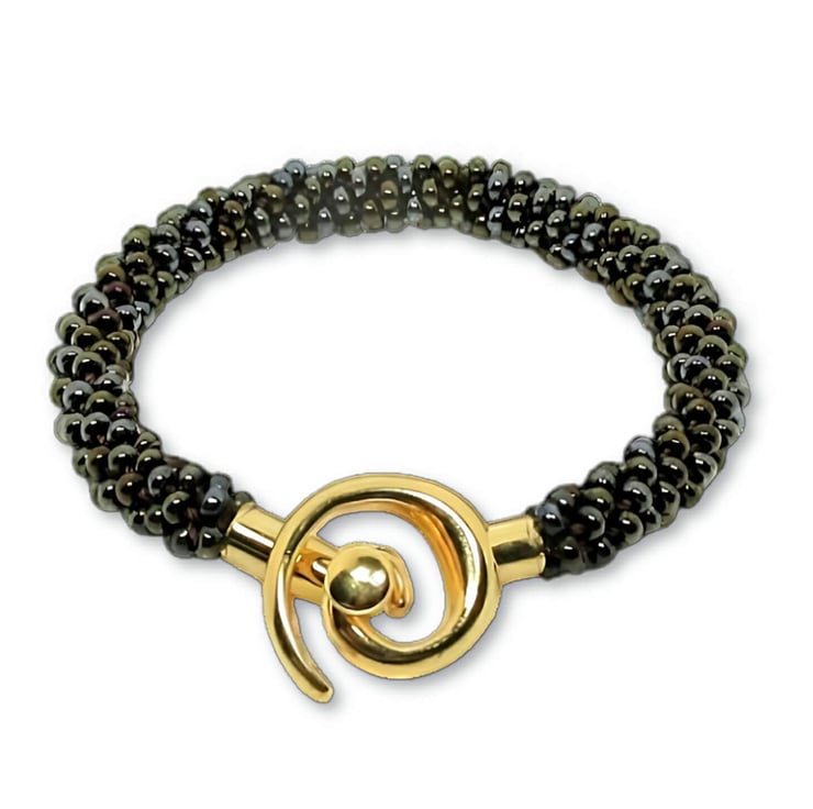 The colours in this bracelet are a lovely bronzed mix of copper, bronze, brown, very dark grey and very dark olive green.