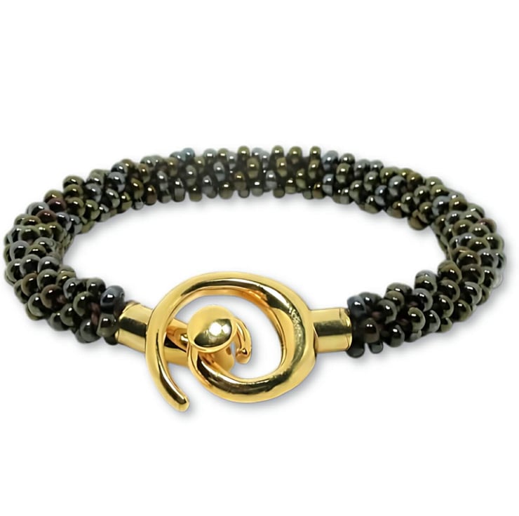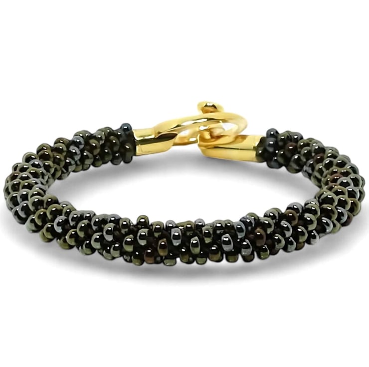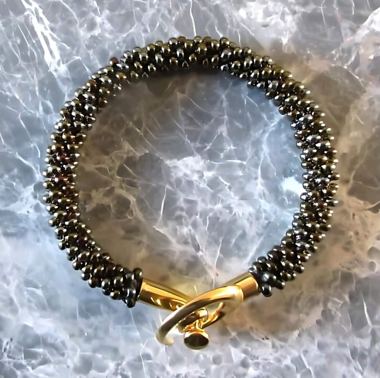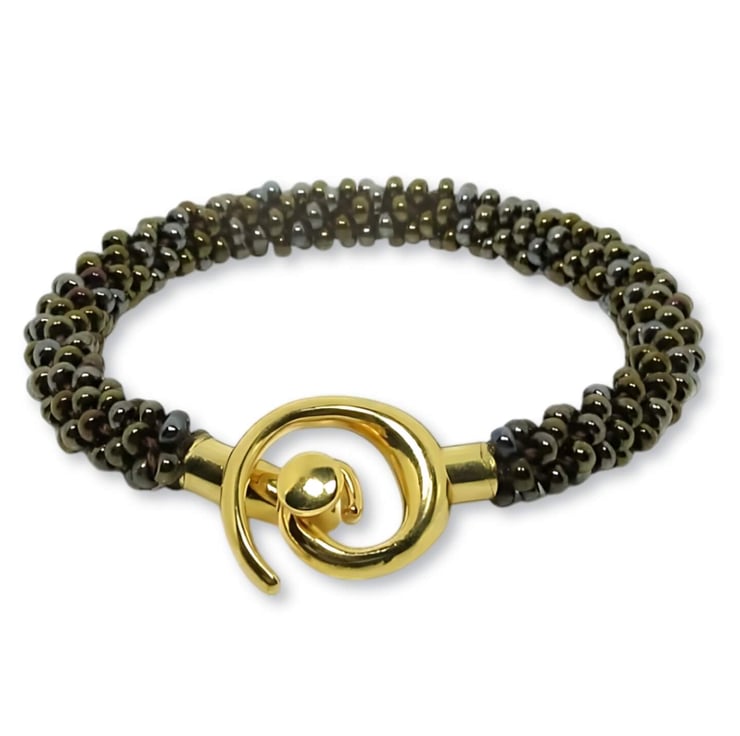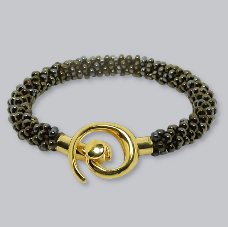 The colours in this bracelet are a lovely bronzed mix of copper, bronze, brown, very dark grey and very dark olive green.