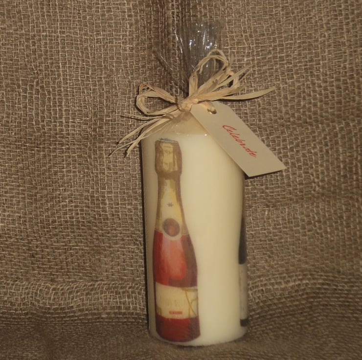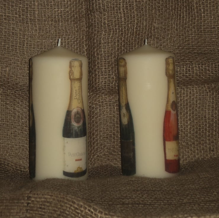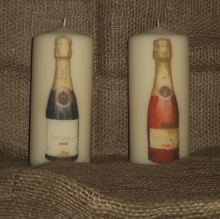 I have decorated this cream candle with napkin images of bottles of champagne and sparkling wine; there are three bottles on the candle, one red, one grey black and one greeny black.