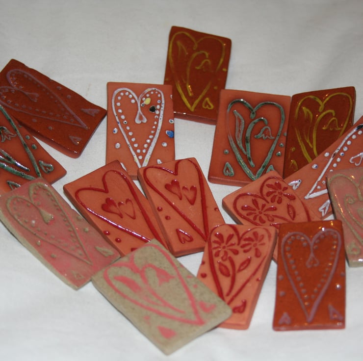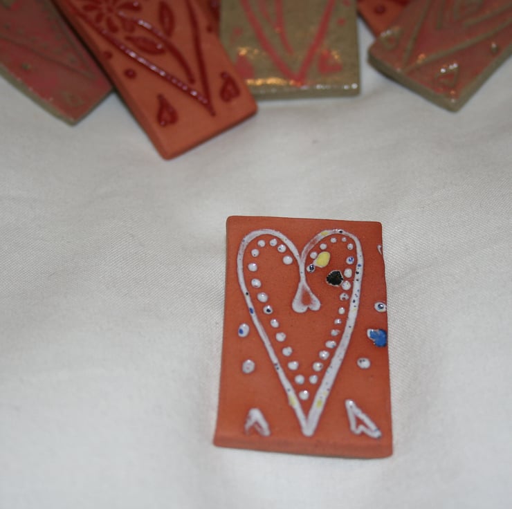 Handmade terracotta clay heart brooch, surface of clay has heart design impressed & after biscuit firing a confetti glaze has been applied & wiped away to leave glaze in the impressed sections.