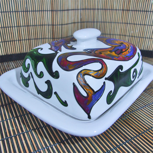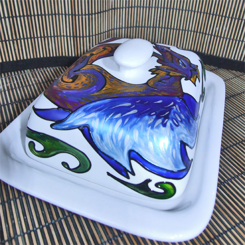 This is a listing for a hand painted ceramic trinket dish or butterdish... dual purpose, hehe, decorated with a mult-icoloured dragon. It is completely unique and the only one of this design.