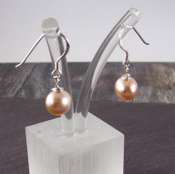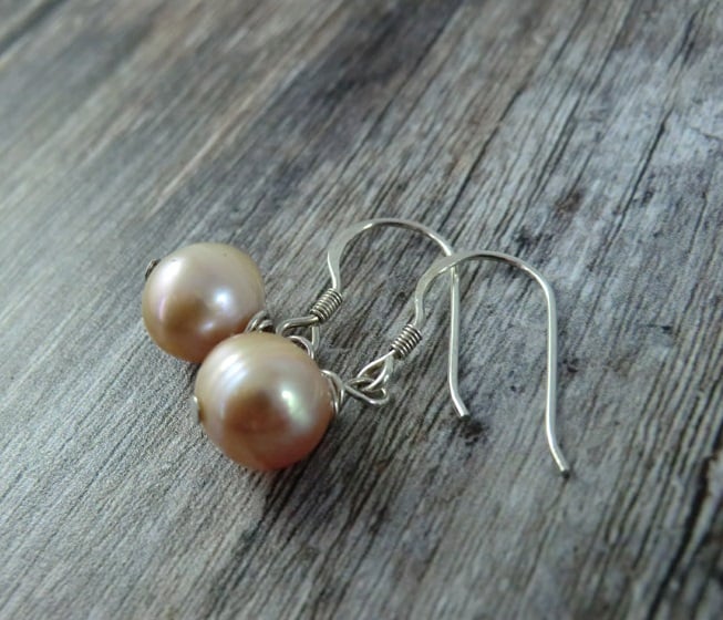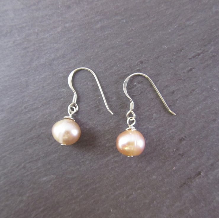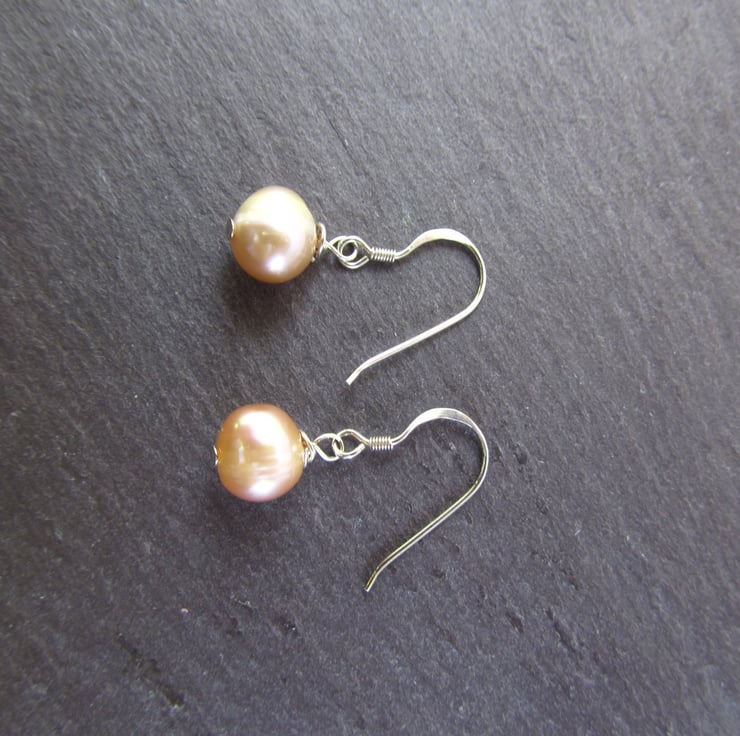 These beautiful peach pearl silver earrings have a classic quality to them. They are created from real pearls and 925 silver. Perfect for everyday wear, brides or that special occasion.