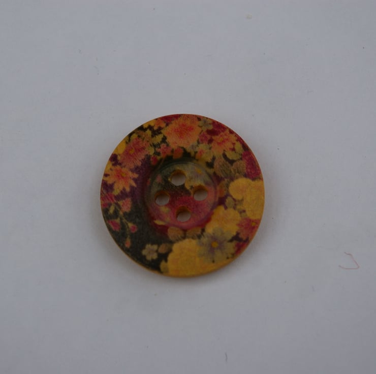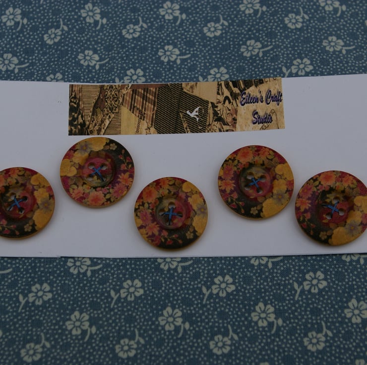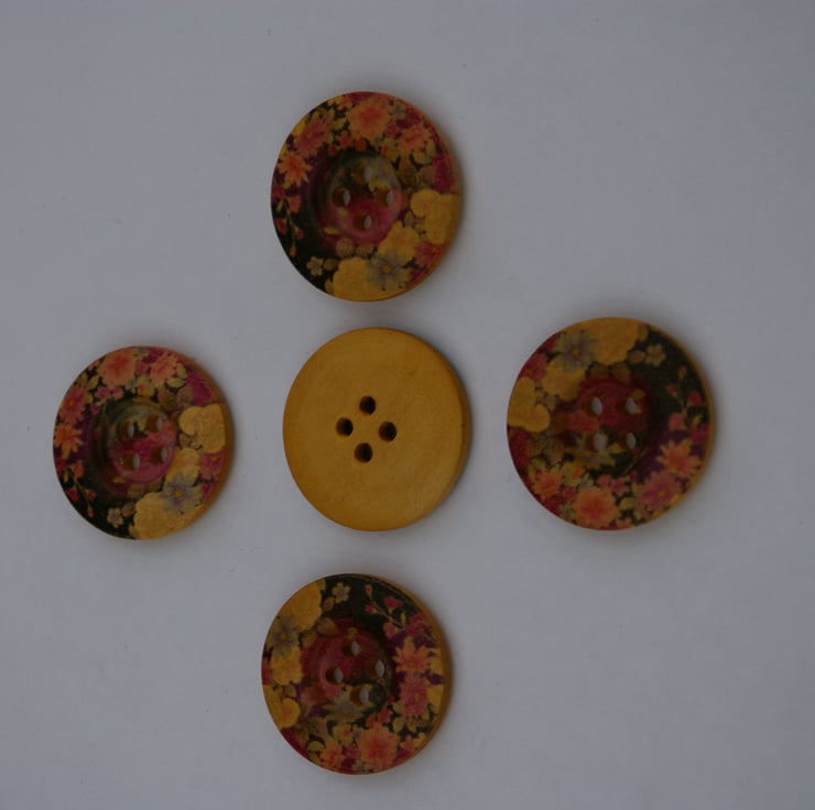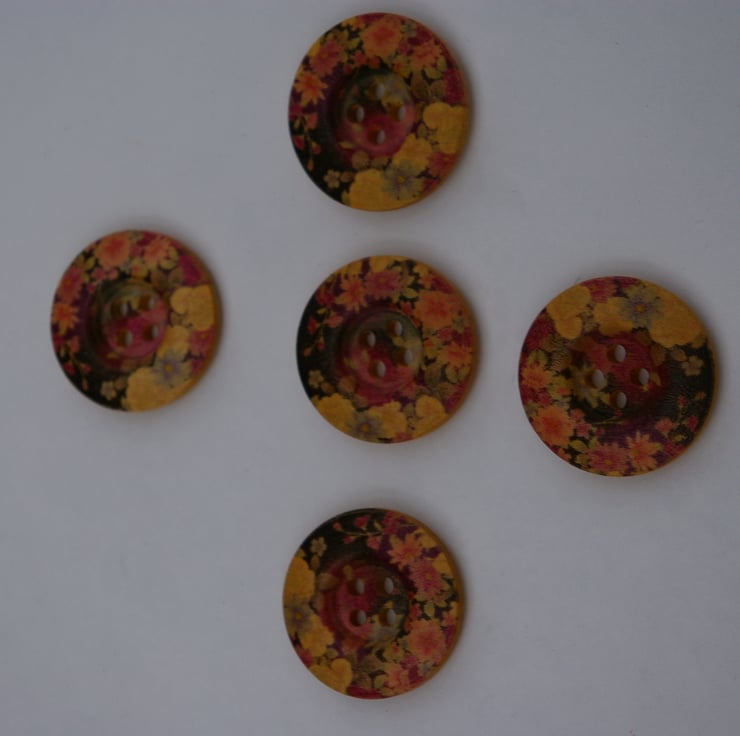 Five pretty wooden buttons. Each one has a printed pattern consisting of pink and white flowers on a black background. Each button is indented and has four sewing holes. These buttons are sure to brighten up many a project.