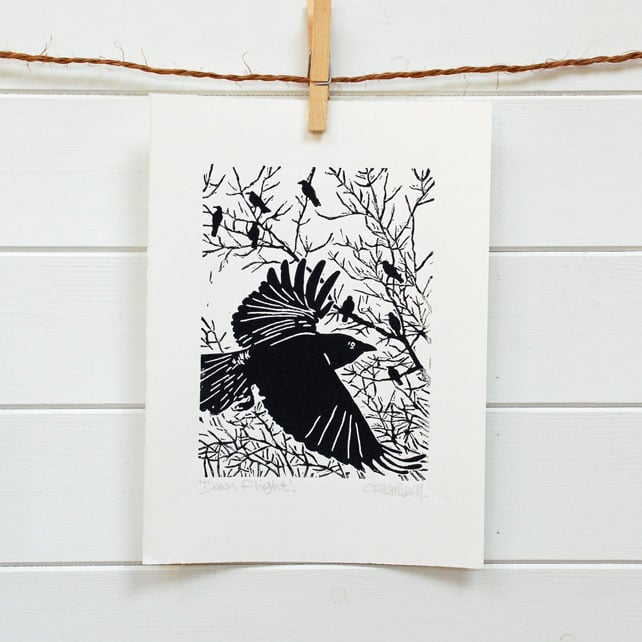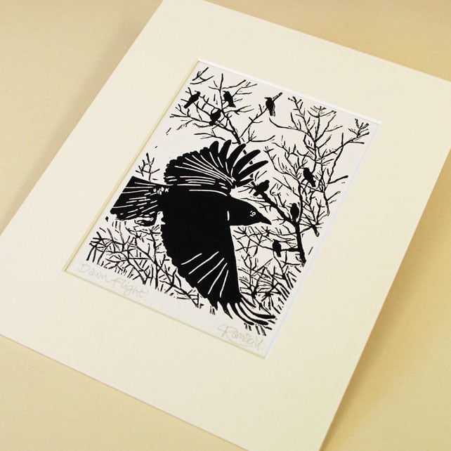'Dawn Flight' - Black Crows - Original, hand pulled Linocut Print, printed on hand press, available in black ink. Image of black birds in tree. Supplied in a cream mount. Signed and titled in pencil by the artist.