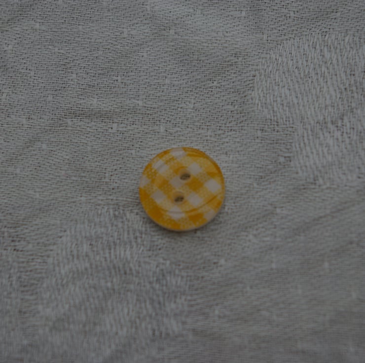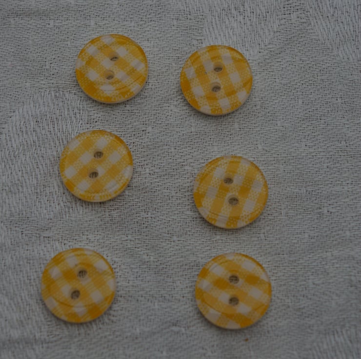 A set of 6 resin buttons. Each button is decorated in a yellow and white check pattern. The buttons also contain two sewing holes each. These buttons may be used in many different crafting projects.
