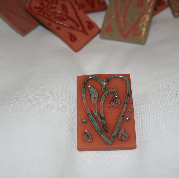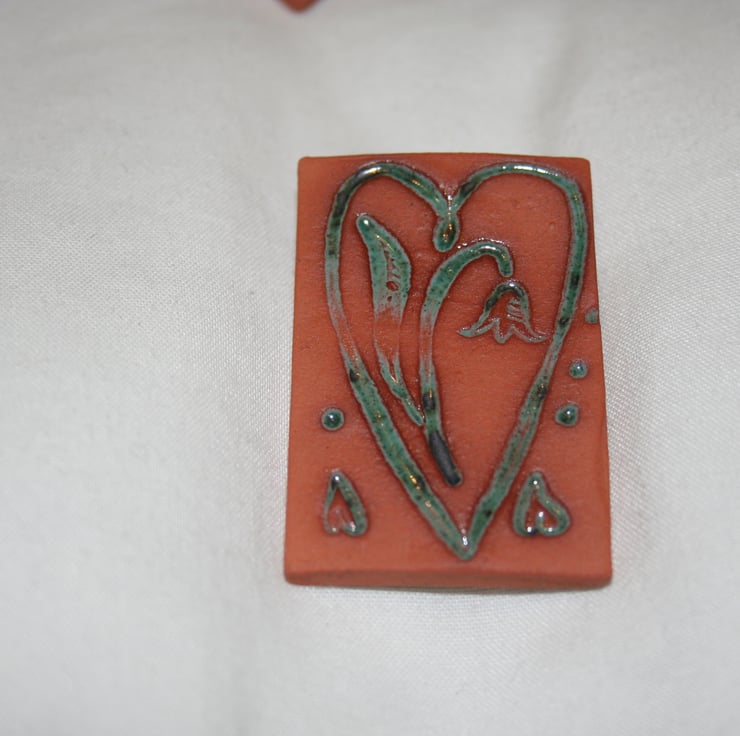Handmade terracotta clay heart brooch, surface of clay has heart design impressed & after biscuit firing a speckled green glaze has been applied & wiped away to leave glaze in the impressed sections.