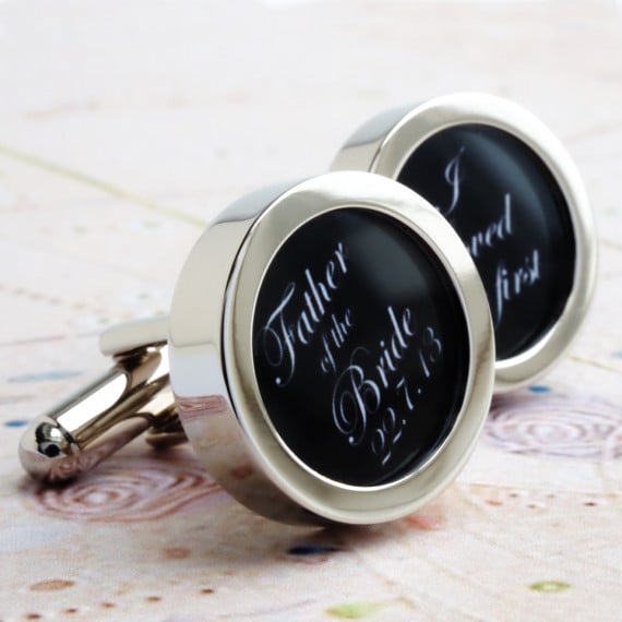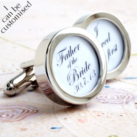 Custom wedding cufflinks for the Father of the Bride with your wedding date on one cufflink and 'I loved her first' on the other. Written in elegant black script lettering on a white background. Also available with a black background or your choice of custom colour.