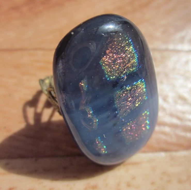 This cabochon is fitted with a bronze metal filigree adult sized adjustable ring.