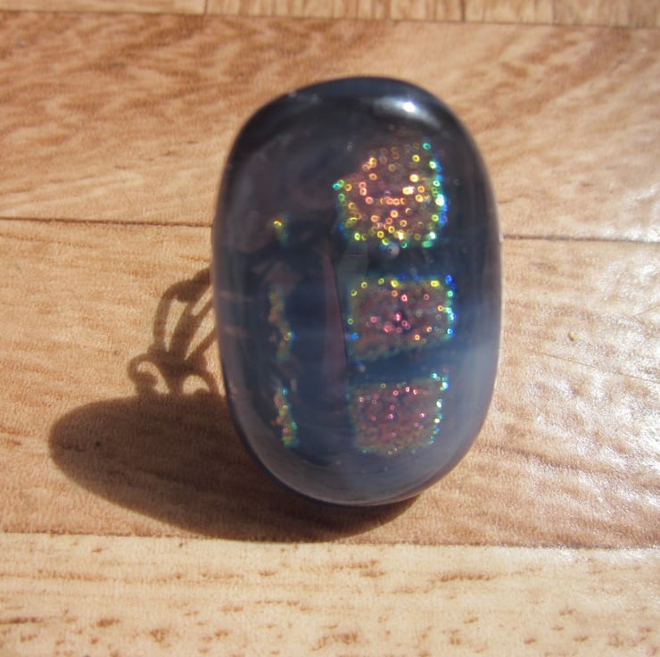 This glass cabochon was fused by me. It has a beautiful dichroic shimmer in pink purple with a smoke, almost purple grey, base. It is approximately 3/4 inches across. It is impossible to do justice to the delicate dichroic shimmer in the photograph.