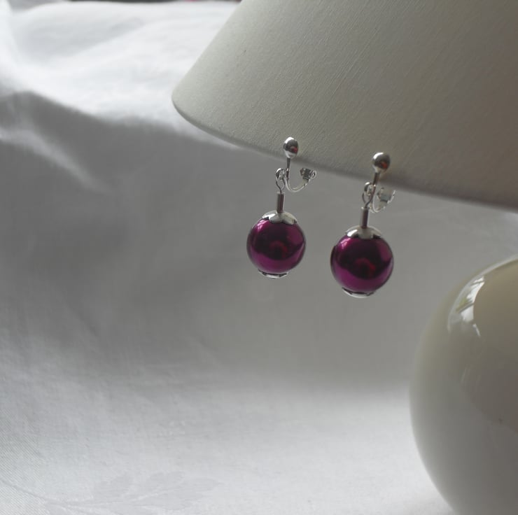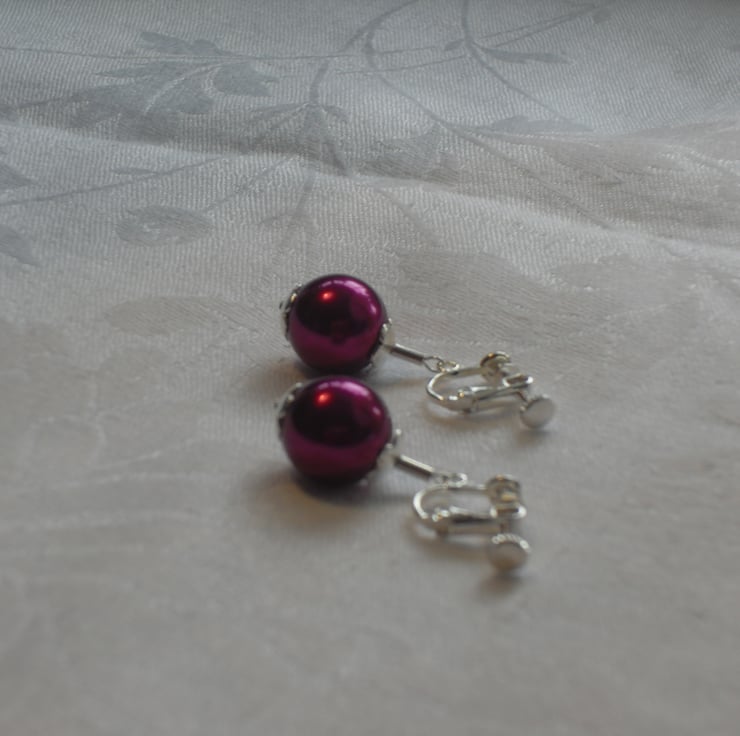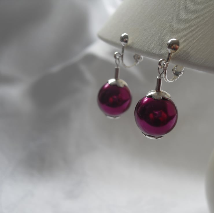 Made to order. A deep cerise Czech glass pearl with sterling silver flower beadcaps, headpin and tube beads make a gorgeous combination for these earrings. The pearl is 12mm wide and attached to silver plated ear clips with screws for extra adjustment.