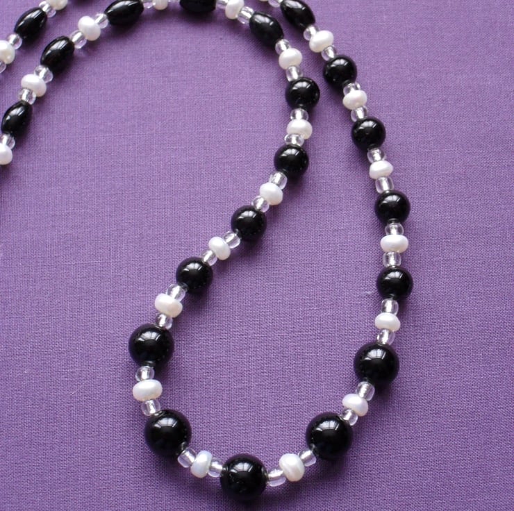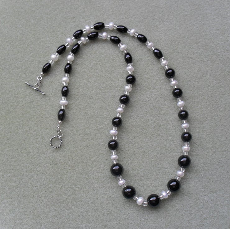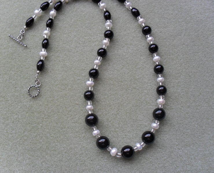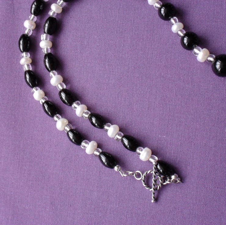 Black onyx,white freshwater pearls and glass seed beads are attached to a 925 bali silver toggle clasp.