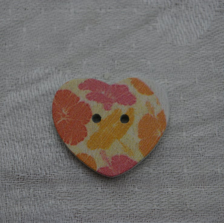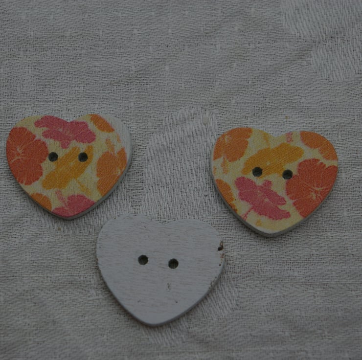 A set of 3 large wooden heart shaped buttons. Each button has first been painted white and then printed with bright cheerful orange, peach and pink coloured flowers. They are a 2 hole button. These buttons may be used in many different crafting projects.