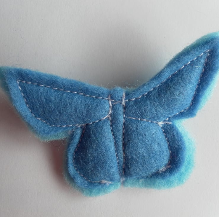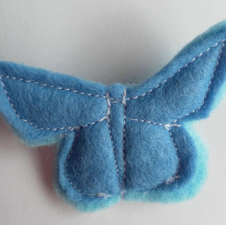 Sweet, Adonis Blue butterfly brooch/badge. It measures 5cm x 3.5cm approximately, is lightly padded and has a brooch pin sewn to the back.