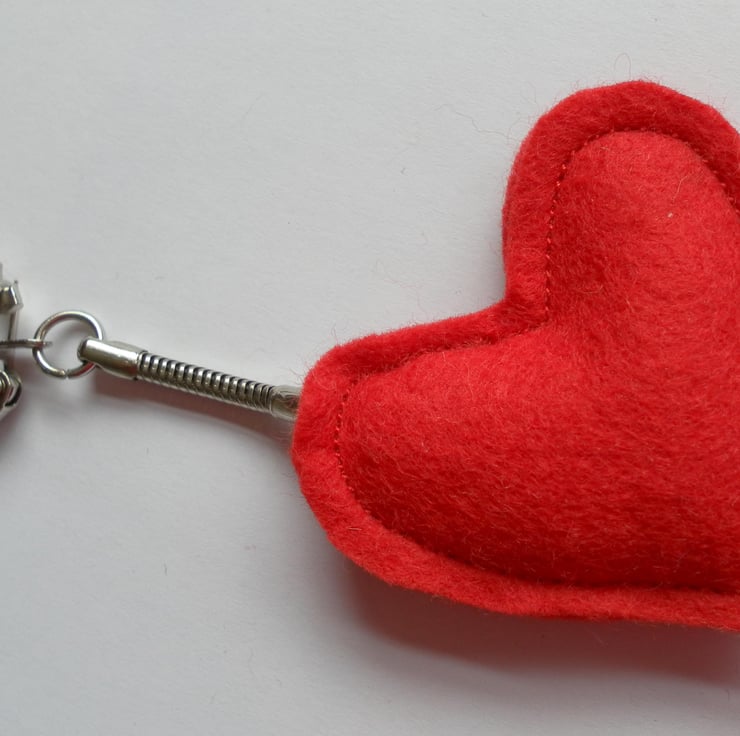 Sweet, red felt heart keyring. Ideal gift. It measures 5cm x 5cm approximately, is lightly padded and has a keyring chain sewn to the back.