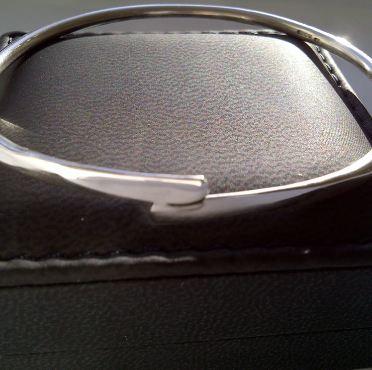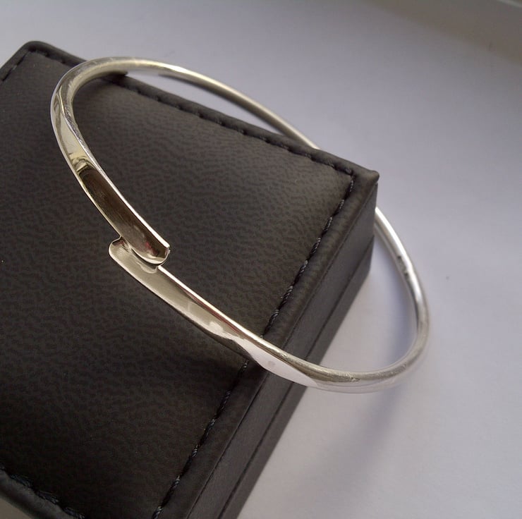Made from 3mm round sterling silver, it has been forged to gently flatten and taper the silver into two overlapping ends. The bangle is then soldered shut for additional strength and security. It measures 64mm internal diameter, so it is size small , but it can be made in other sizes - simply message me to request this.