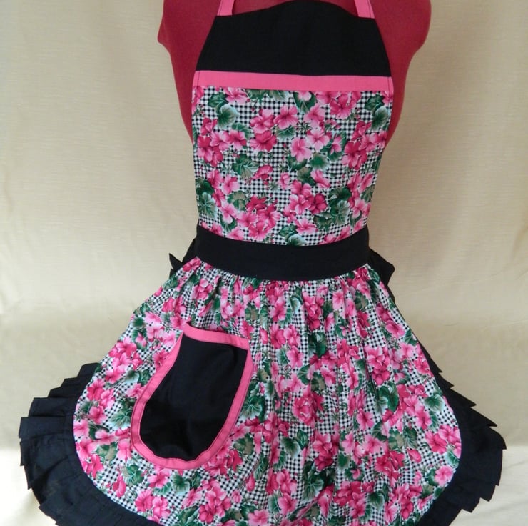 Here we have a lovely cotton rich black and pink flowers retro style apron, handmade in house to our own design. (see photos). Adjustable neck and waist ties so will fit up to a size 22.