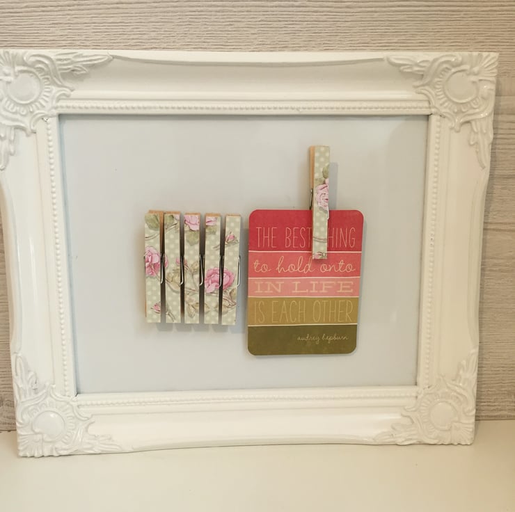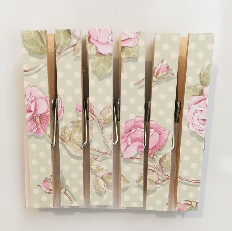 A charming set of 6 decoupaged wooden pegs with magentic strip attached to the back of them. The paper used is scrapbook paper from a range of vintage kitchen desgins. The paper is cut so that when together the picture can be viewed across the set.