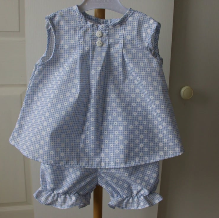 This set is lovely for a baby girl the fabric looks so fresh and cool with the tiny little white daisy on the light blue and white gingham it makes it feel so summer day wear the set has every thing for a little princess out for the day, with every thing matching what more could she want.