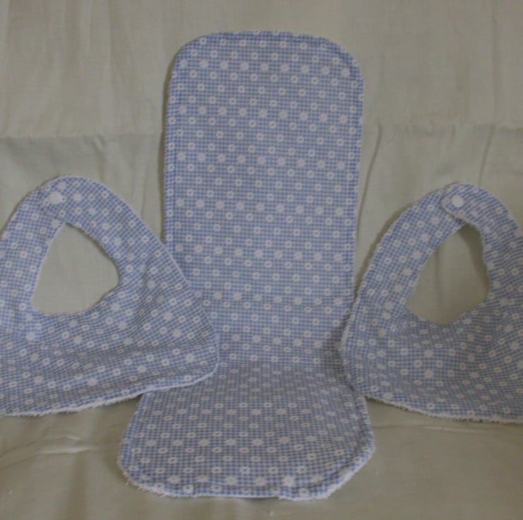 The two bibs and dribble cloth are backed in 100% terry towelling cotton fabric bibs have white poppers all are edge stitched .