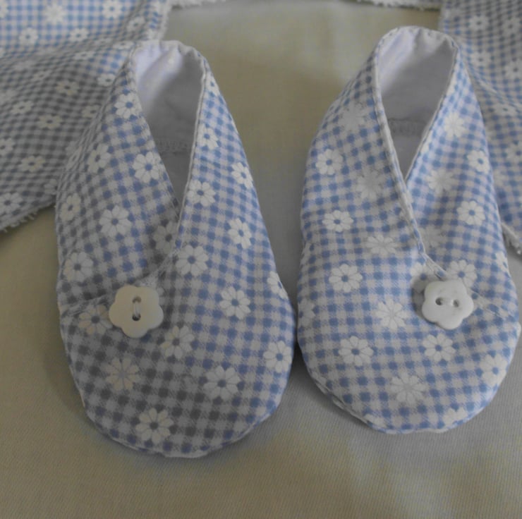This beautiful and unique handmade baby girls dress,pants,shoes,bibs and dribble cloths are all made from matching light blue and white tiny gingham that has a little daisy on the it. this is a lovely fabric so cute for a little girl.