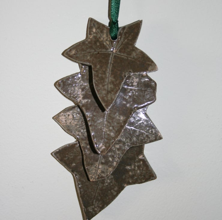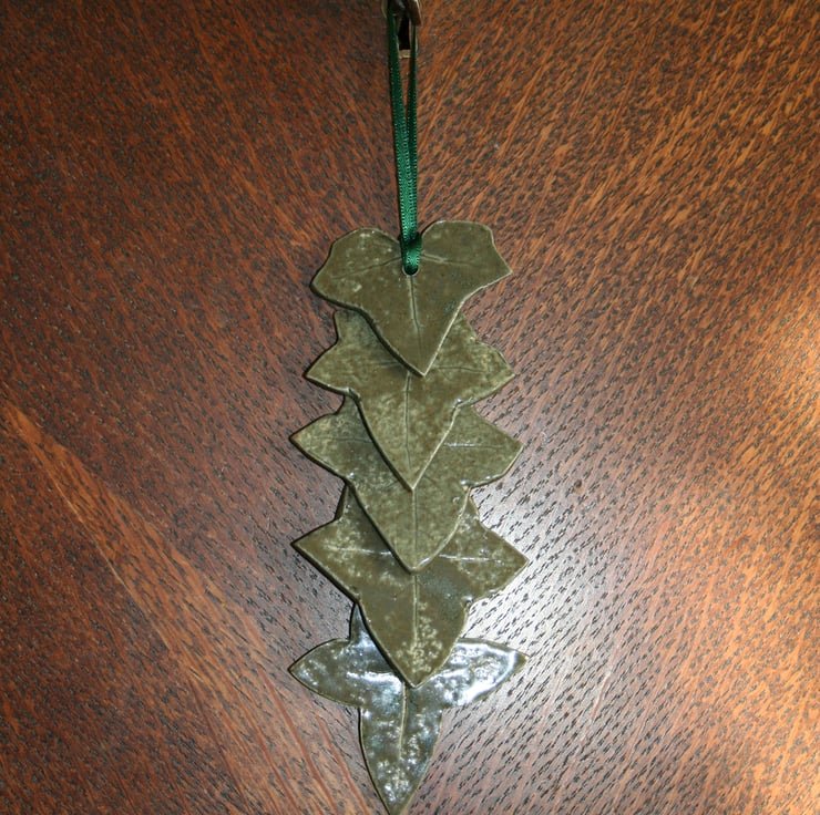 Handmade ceramic ivy leaf decoration, stoneware clay rolled out & impressed with ivy leaf design & cut out (slightly different shapes & sizes). Biscuit fired & then shiney green glaze applied & fired again. Slight hint of leaf veins show on the surface, 6 leaves attached.