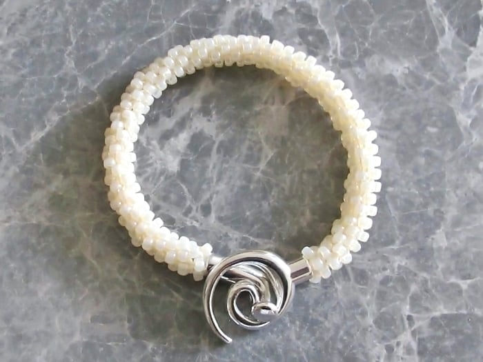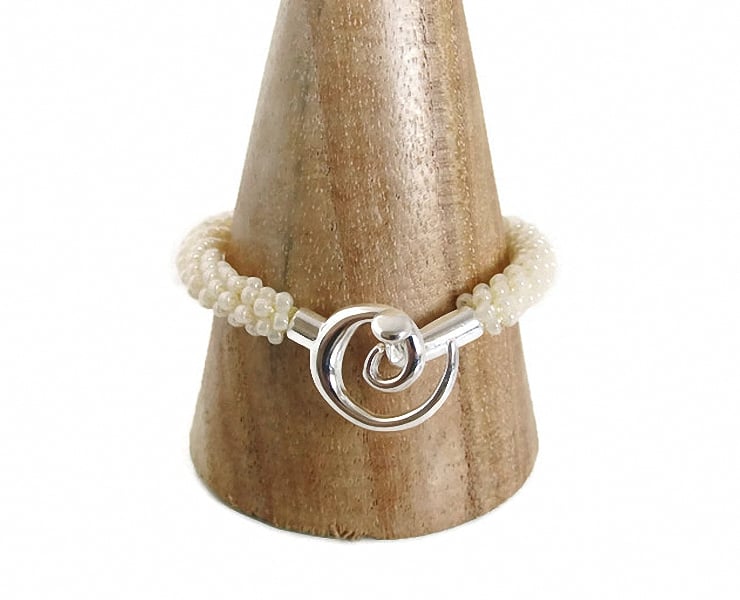 The clasp is silver plated and is in the design of a swirl and a toggle bar which slides around the swirl clasp creating a lovely feature for this bracelet.