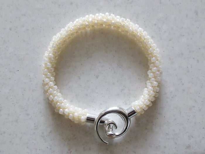 The clasp is silver plated and is in the design of a swirl and a toggle bar which slides around the swirl clasp creating a lovely feature for this bracelet.