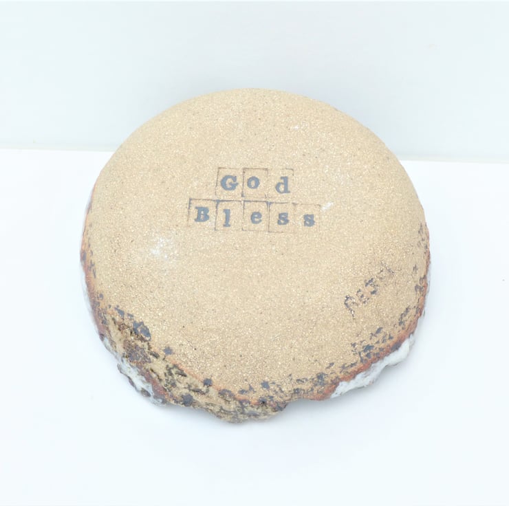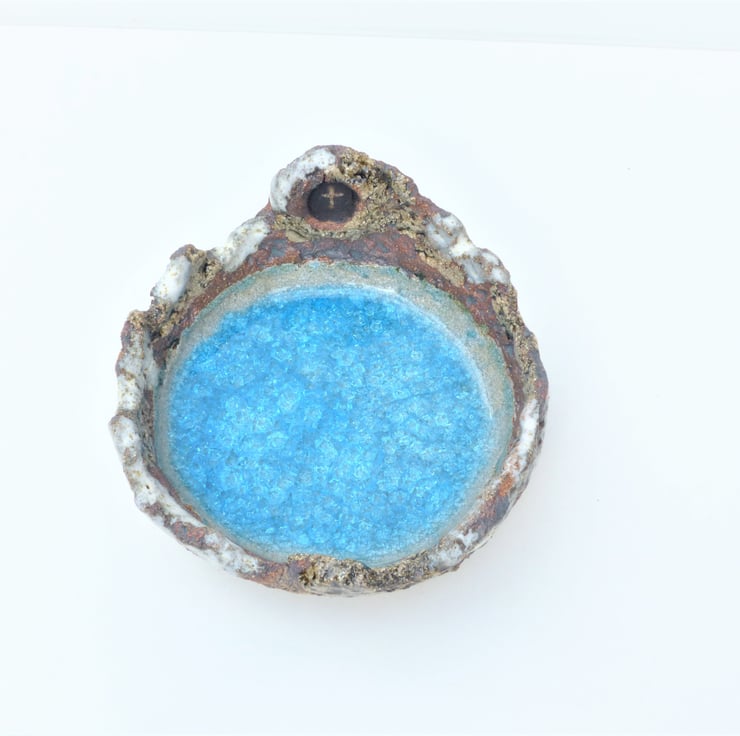I hand built this bowl, textured it and then added the detail before bisque firing. I then washed it with an oxide and painted in the detail. Two glazes were applied to give the bowl extra depth. I then fired it a second time to 1220C with recycled glass in the base which melts and pools.